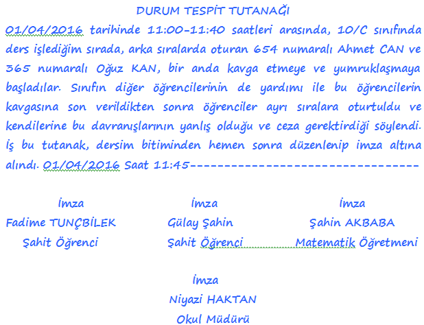 4- Sınıfta Kavga veya Disiplinsizlik Olayları İçin Yazılan Tutanak