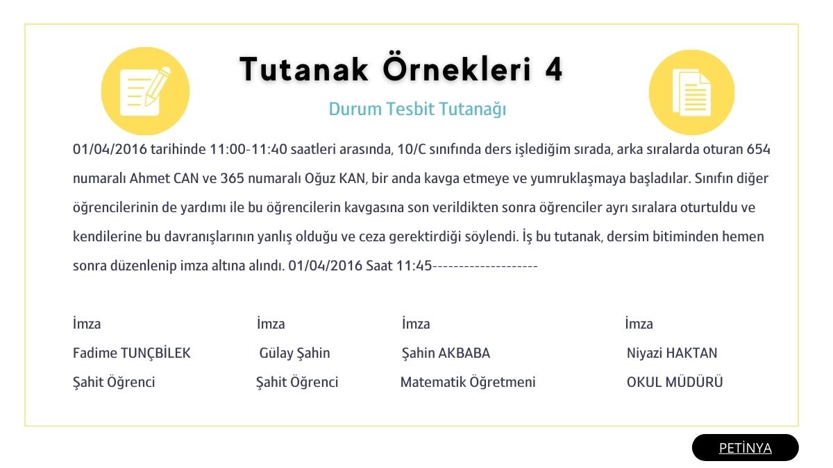 Tutanak, belirli bir olay veya durumun resmi olarak kayıt altına alındığı yazılı bir belgedir. Okulda ya da resmi bir kurumda yaşanan olumsuzlukları veya olayları yazılı olarak kaydetmek, gelecekte yaşanabilecek sorunlardan korunmanıza yardımcı olabilir. Bu nedenle, sorumluluk sahibi herkes bu tür durumlarda tutanak tutmalı ve ilgili yetkililere sunmalıdır. Bu sayfada yazılan tüm dökümanları PDF formatında indirebilirsiniz.